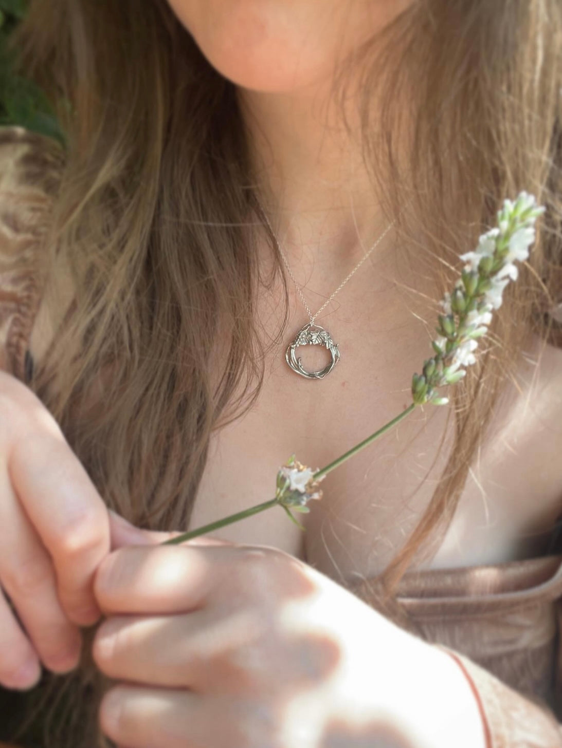 Handcrafted sterling silver wreath pendant with leaf and grape detail. A one of a kind piece that can never be duplicated. Hallmarked by the London Assay Office.