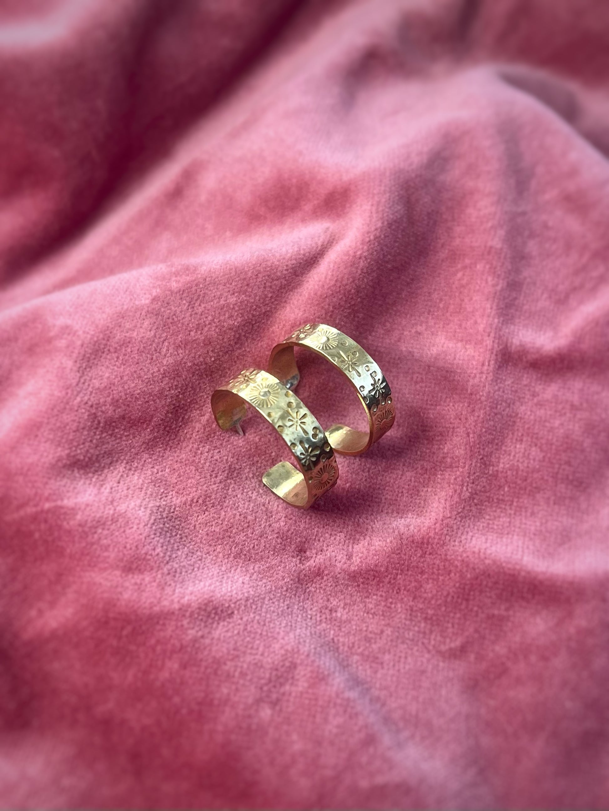 Companion piece to the Le Soleil ring. Hammered brass hoop earrings with sun motif, inspired by the 19th card of the Major Arcana.